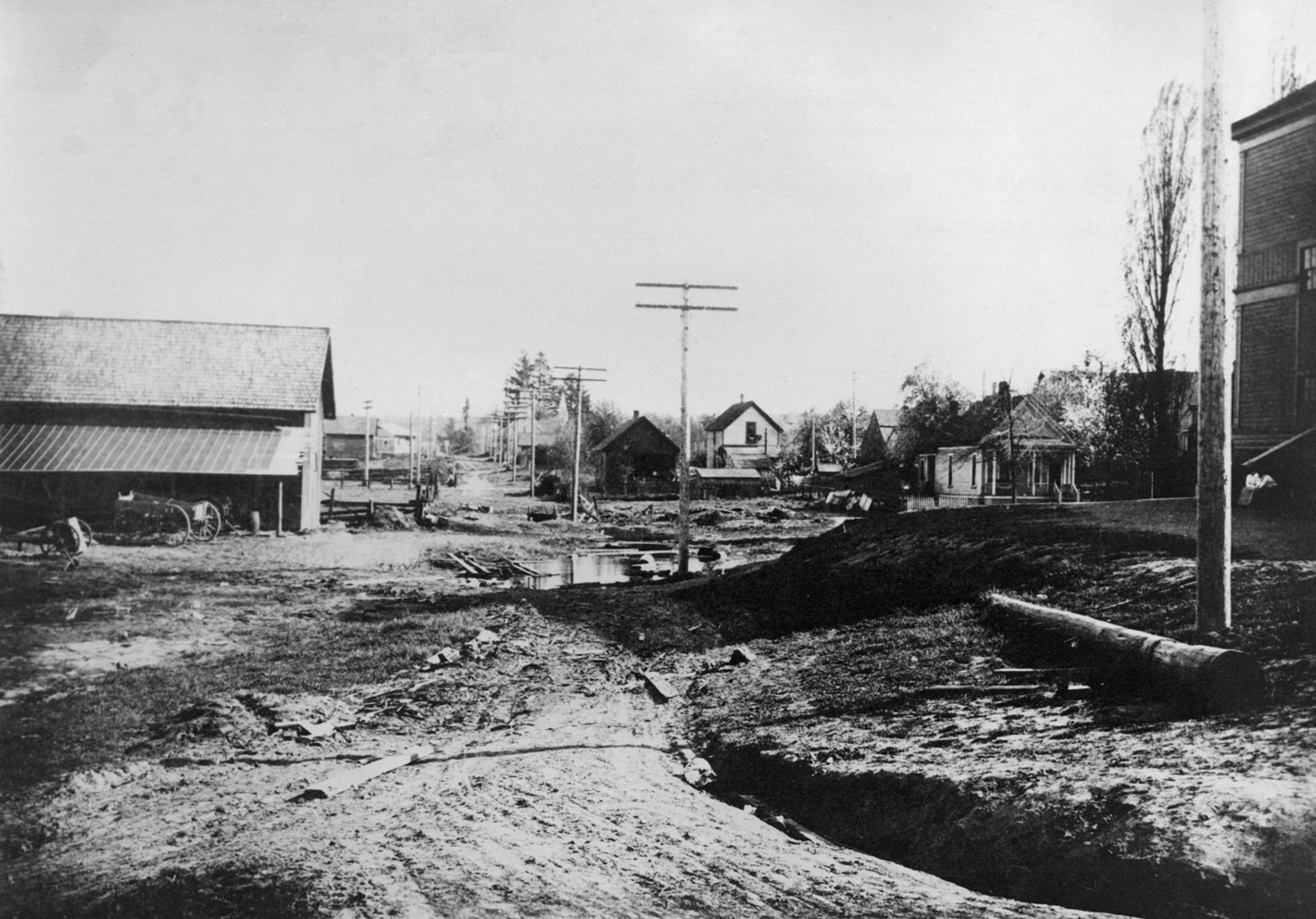 If it's Thursday - it must be #ThrowBackThursday! This week we're rolling back nearly 100 years (circa 1920) with a shot of an "unimproved" 21st Avenue looking south between Harrison and Jackson Streets - behind the old Milwaukie School (today's City Hall). See comments for additional details. #MilwaukieTBT #HistoricMilwaukie #21stAvenue #HarrisonStreet #JacksonStreet #LookingSouth #Unimproved #Roadway Photo Credit: the Milwaukie "Then and Now" book (published around 1980) available at the #MilwaukieHistoricalSociety - visit them on Facebook here: http://ow.ly/UioOe #OregonHeritage If you look closely you can see the SE corner of the old Milwaukie School on the far right and a couple of students sitting on the steps. On the left is a structure that resembles the Milwaukie Lumber building, but we don’t think this building is in the right place to be the present-day Milwaukie Lumber structure (it appears to be too close to the school). And in the center of the picture, down 21st Avenue at Jefferson Street, hidden behind the telephone poles, is the original St. John Episcopal Church building that was floated down the Willamette River in the 1960s and is now the Oaks Pioneer Chapel near Oaks Amusement Park in Sellwood.