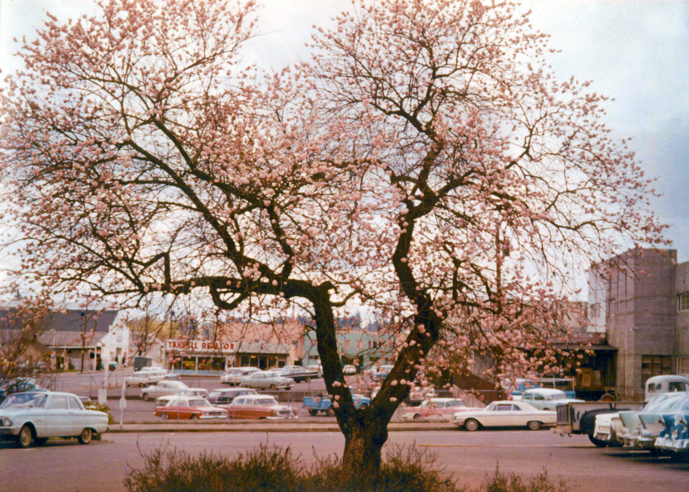 160421 TBT Week 29 - View of Seth Lewelling's Ornamental Peach Tree in the City Hall Parking Lot, looking south (circa 1960s)