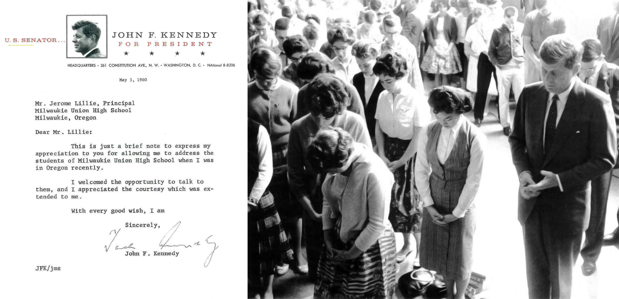 160505 TBT Week 31 - Letter from US Senator John F. Kennedy to Milwaukie High School Principal Jerome Lillie dated May 3, 1960, and photo of Senator Kennedy and MHS Students
